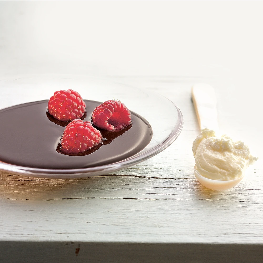 Eine cremige Ganache mit Himbeeren und Topfen, umhüllt von herber Edelbitterschokolade mit 70 % Kakaoanteil.