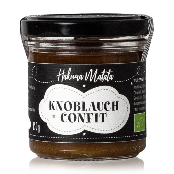 Mit diesem Knoblauch-Confit kaufen Sie ein von Hakuna Matata Freiburg in Handarbeit gefertigtes Produkt. Die beiden Köche Michael Hofer und Philip Klingel haben mit Ihrer Freiburger Manufaktur Hakuna Matata die traditionelle Einmachkunst entstaubt. Täglich produzieren sie von Hand Eingewecktes und Eingekochtes – mal zeitgemäß, dann extravagant oder auch klassisch. Hakuna Matata nutzt ausschließlich Produkte der Saison – Erdbeermarmelade im Winter kochen oder Zitrusfrüchte im Sommer zu verarbeiten sind keine Option. Aber die Produkte der Freiburger Manufaktur, die gibt es ganzjährig bei uns im Viktualien.shop.