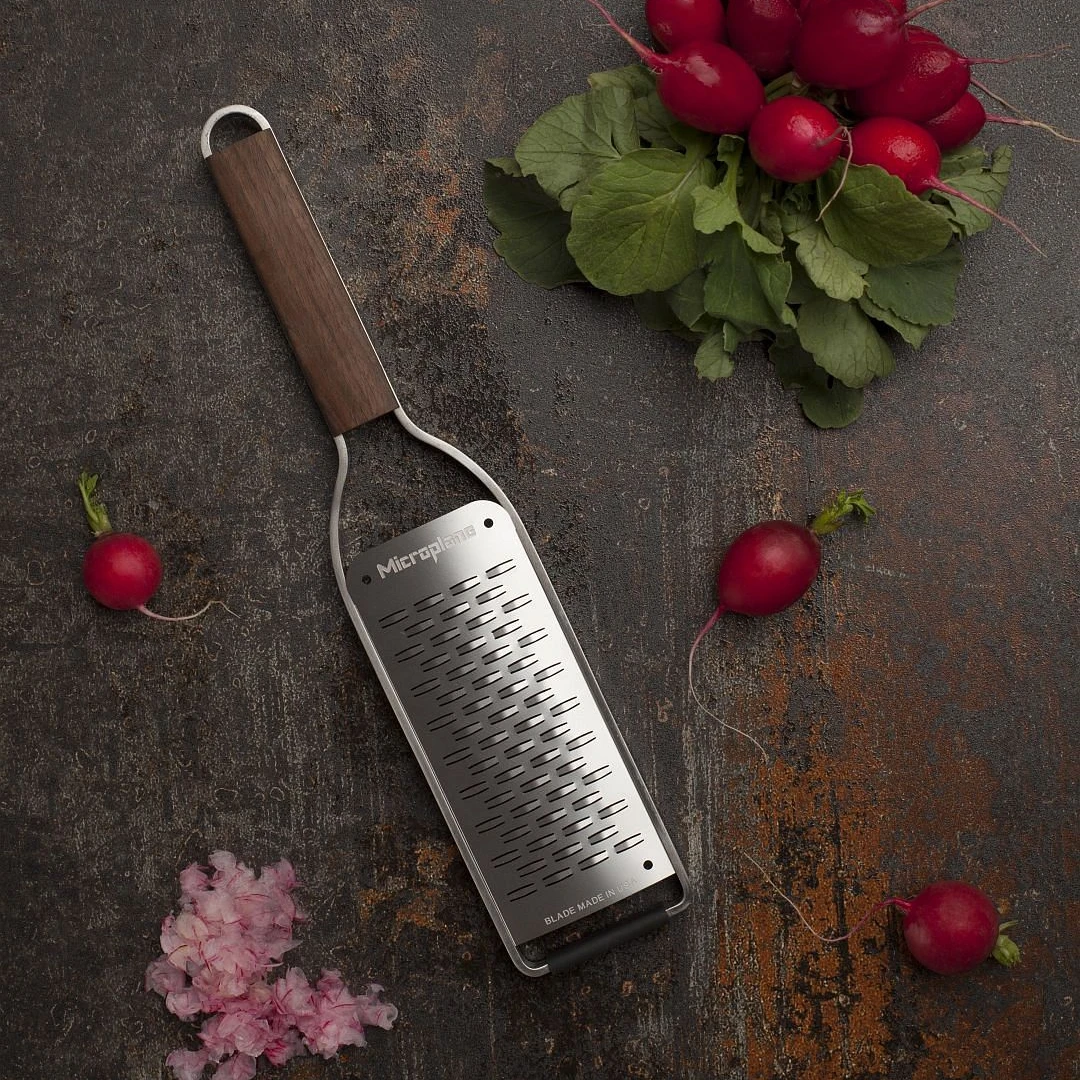 Die Master Serie von MICROPLANE ist die elegante, stilvolle Kollektion perfekt funktionierender, garantiert haltbarer Küchenreiben. Sie spiegelt das ikonische Erbe der Anfänge der Firma als Werkzeugmacher für die Holzbearbeitung. Die außergewöhnlich schönen, geölten Nussholzgriffe liegen angenehm in der Hand und verleihen diesen praktischen Küchenhelfern ein unverwechselbar warmes und schickes Design.