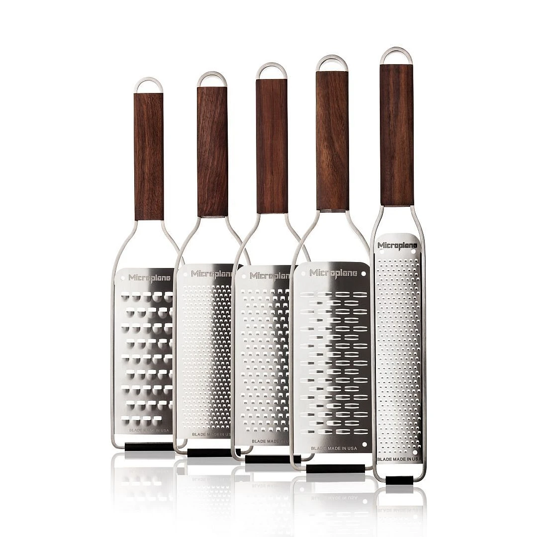 Die gesamte Serie besteht aus Reiben mit fünf verschiedenen Klingen: Zester #1, Fein #2, Grob #3, 2-Wege-Schneide #4 und Sehr Grob #5.