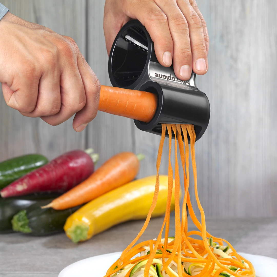 Einfach schnell! Dieser Spiralschneider von MICROPLANE verwandelt Zucchini in knackige (Zoodles) oder Ihr Lieblingsgemüse in Gemüsespaghetti. Aufgrund der langlebigen, ultrascharfen Edelstahlklingen von Microplane ist das Schneiden von Karotten, Süßkartoffeln, Kürbis ein Kinderspiel. Die langen, dünnen Bänder können dann blanchiert, als attraktive Rohkost serviert oder zur dekorativen Garnitur verwandt werden. Kreieren Sie Spiralen und Streifen für Gluten-freie Gemüsepasta, Salate oder dekorative Rohkost.