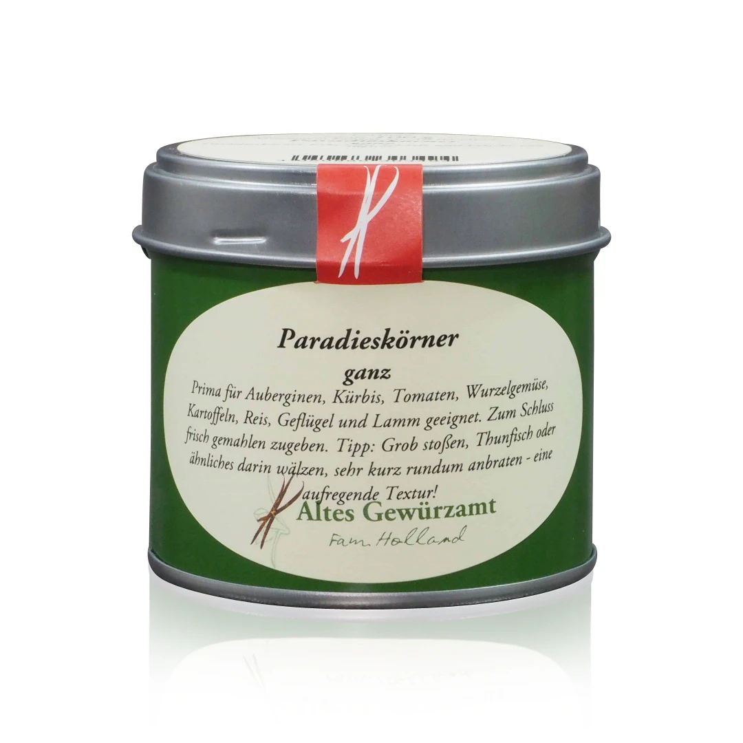 Mit diesen Paradieskörnern kaufen Sie ein von Altes Gewürzamt Ingo Holland sorgfältig ausgewähltes und zusammengestelltes Gewürz in bester Qualität. Gründer Ingo Holland – selbst langjähriger Spitzen- und Sternekoch – hatte irgendwann genug davon nur Gewürze kaufen zu können, die nicht seinem Qualitätsanspruch gerecht wurden. So entschloss er sich, selbst auf die Such nach besten Qualitäten von Gewürzen aus aller Welt zu gehen und diese in seiner eigenen Manufaktur handwerklich, schonend und sorgfältig zu verarbeiten. Berühmt auch seine Gewürzmischungen für Chili con Carne oder das italienisch toskanische Gewürzmischung für Pasta.