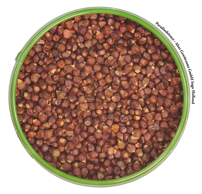 Die exotischen Paradieskörner sind die Samen eines Ingwergewächses mit dem wunderschönen Namen Aframomum melegueta. Es stammt aus dem westlichen Afrika und ist eng mit dem bei uns bekannterem Kardamom verwandt. Paradieskörner werden gemahlen oder im Ganzen als Gewürz in den Küchen West- und Nordafrikas verwendet. Schon vor 2.000 Jahren wurde der „Afrikanische Pfeffer“ von Plinius der Ältere erwähnt. Im 14./15. Jahrhundert waren sie ein beliebter Ersatz für schwarzen Pfeffer …oder um abgestandenen Wein zu verbessern und die Körpersäfte zu stärken. Heute werden Paradieskörner in der Gourmetküche, besonders in Nordamerika, als Ersatz für Pfeffer verwendet oder um Craftbieren, Gins und Aquavit einen einzigartigen Geschmack zu verleihen.