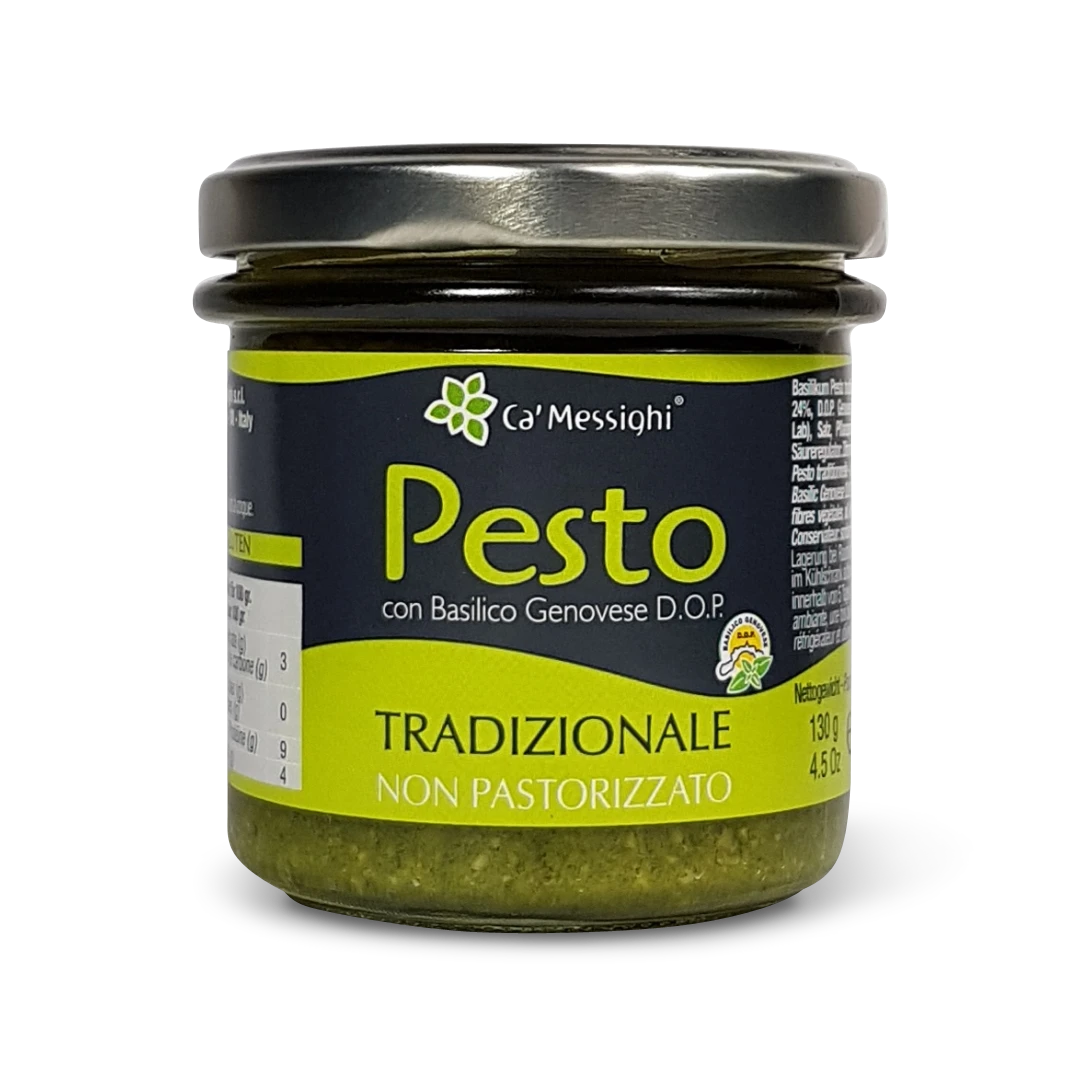 Großvater Luigi sagte eins: Nur wenn man mit guten Sachen arbeitet, wird es gut. Mit dieser Pesto Genovese Tradizionale kaufen Sie eine von Ca’ Messighi handwerklich nach ligurischer und italienischer Tradition hergestellte Pastasauce. Aus DOP-zertifiziertem Genueser Basilikum und großartigem Olivenöl produziert Ca’ Messighi u.a. traditionelles Pesto Genovese, Pesto Rosso und die berühmte ligurische Walnusssauce Crema di Noci.