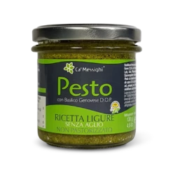 Großvater Luigi sagte eins: Nur wenn man mit guten Sachen arbeitet, wird es gut. Mit dieser Basilikum Pesto ohne Knoblauch nach Ligurischem Rezept kaufen Sie eine von Ca’ Messighi handwerklich nach ligurischer und italienischer Tradition hergestellte Pastasauce. Aus DOP-zertifiziertem Genueser Basilikum und großartigem Olivenöl produziert Ca’ Messighi u.a. traditionelles Pesto Genovese, Pesto Rosso und die berühmte ligurische Walnusssauce Crema di Noci.