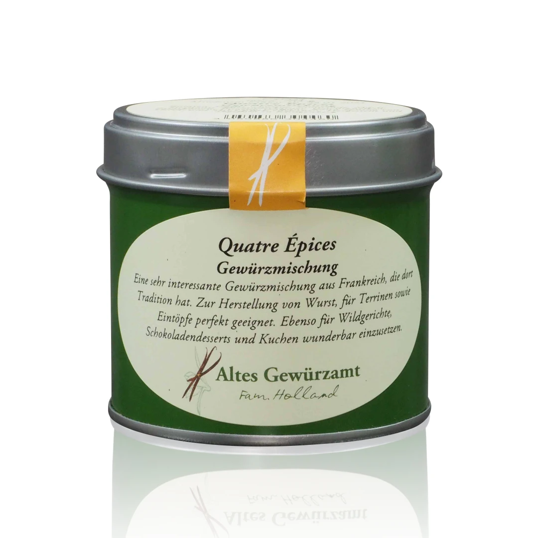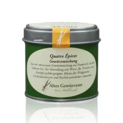 Mit dieser Gewürzmischung Quatre-épices kaufen Sie ein von Altes Gewürzamt Ingo Holland sorgfältig ausgewähltes und zusammengestelltes Gewürz in bester Qualität. Gründer Ingo Holland – selbst langjähriger Spitzen- und Sternekoch – hatte irgendwann genug davon nur Gewürze kaufen zu können, die nicht seinem Qualitätsanspruch gerecht wurden. So entschloss er sich, selbst auf die Such nach besten Qualitäten von Gewürzen aus aller Welt zu gehen und diese in seiner eigenen Manufaktur handwerklich, schonend und sorgfältig zu verarbeiten. Berühmt auch seine Gewürzmischungen für Chili con Carne oder das italienisch toskanische Gewürzmischung für Pasta.
