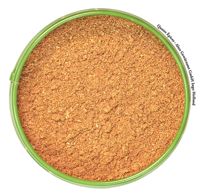 Ingo Hollands Interpretation der klassischen Quatre-épices, vier Gewürze, sind eigentlich derer neun. Nicht fehlen dürfen Pfeffer, Zimt, Muskat und Piment. Die Vier-Gewürz-Mischung ist eine der bekanntesten Gewürzmischungen der französischen Küche.