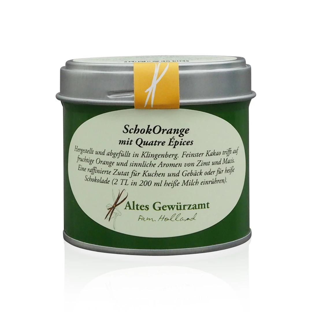 Mit dieser SchokOrange mit Quatre Èpices kaufen Sie ein von Altes Gewürzamt Ingo Holland sorgfältig ausgewähltes und zusammengestelltes Gewürz in bester Qualität. Gründer Ingo Holland – selbst langjähriger Spitzen- und Sternekoch – hatte irgendwann genug davon nur Gewürze kaufen zu können, die nicht seinem Qualitätsanspruch gerecht wurden. So entschloss er sich, selbst auf die Such nach besten Qualitäten von Gewürzen aus aller Welt zu gehen und diese in seiner eigenen Manufaktur handwerklich, schonend und sorgfältig zu verarbeiten. Berühmt auch seine Gewürzmischungen für Chili con Carne oder das italienisch toskanische Gewürzmischung für Pasta.