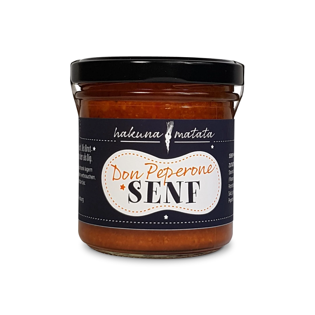 Mit diesem Don Peperone Senf kaufen Sie ein von Hakuna Matata Freiburg in Handarbeit gefertigtes Produkt. Die beiden Köche Michael Hofer und Philip Klingel haben mit Ihrer Freiburger Manufaktur Hakuna Matata die traditionelle Einmachkunst entstaubt. Täglich produzieren sie von Hand Eingewecktes und Eingekochtes – mal zeitgemäß, dann extravagant oder auch klassisch. Hakuna Matata nutzt ausschließlich Produkte der Saison – Erdbeermarmelade im Winter kochen oder Zitrusfrüchte im Sommer zu verarbeiten sind keine Option. Aber die Produkte der Freiburger Manufaktur, die gibt es ganzjährig bei uns im Viktualien.shop.