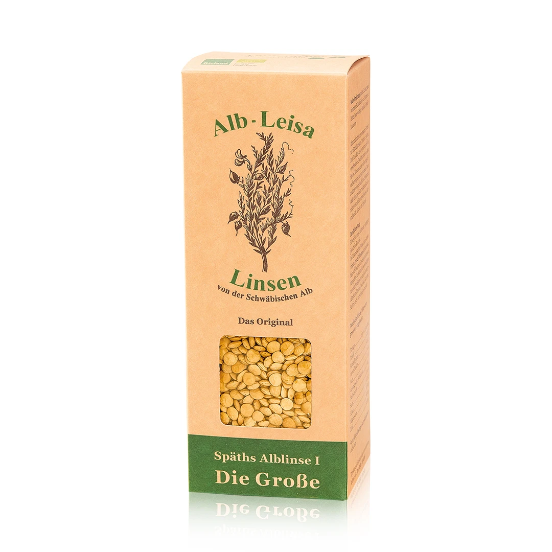 Mit dieser Späths Alblinse I Die Große kaufen Sie ein von der Erzeugergemeinschaft Lauteracher wiederentdecktes Produkt. Um das Jahr 1960 hörte der letzte Linsenbauer auf der Schwäbischen Alb mit dem Anbau der alten, einheimischen Linsensorten auf und das Wissen um die traditionelle Alb-Leisa, die echte Alblinse, verschwand. Im Jahr 2006 entdeckte Woldemar Mammel in einer Saatgutbank die alten Alb-Leisa-Sorten wieder und holte „Späths Alblinse I“ (Die Große) und ‚Späths Alblinse II“ (Die Kleine) zurück nach Deutschland. Seit 2009 übernimmt Lutz Mammel vom Hof Mammel die Linsenaufbereitung und Vermarktung für die Mitgliedslandwirte der Öko-Erzeugergemeinschaft Alb-Leisa. Seit 2011 sind die „Feinschmeckerlinsen der Schwäbischen Alb“ wieder erhältlich. Slow Food Deutschland unterstützt mit dem Presidio Alblinse seit 2012 die Erhaltung des lokalen Ökosystems Schwäbische Alb mit den regionalen Traditionen und lokalen Agrarprodukten.