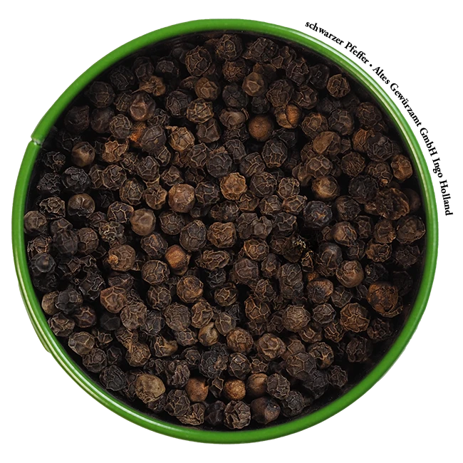 Schwarzer Sri Lanka Pfeffer verleiht dunklen Saucen, Wild-, Rindgerichten und Gemüse eine edle Schärfe.