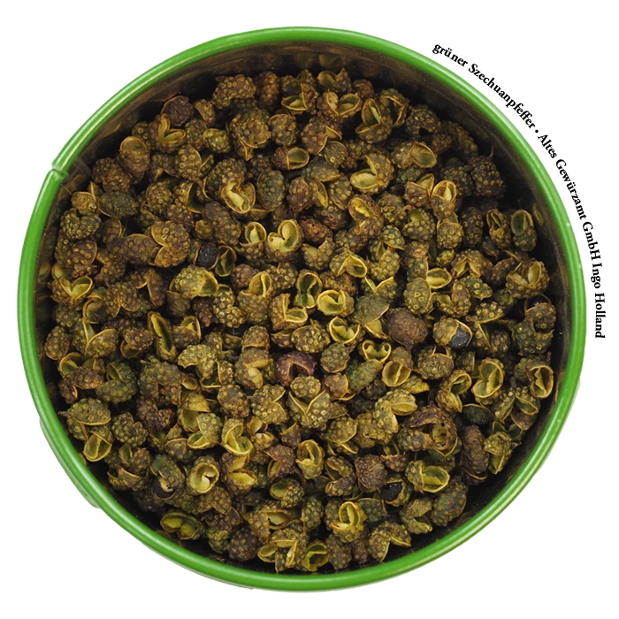 Verwendung: Asiatische Küche, Wok-Gerichte; zu Bitterschokolade & Zitrus-Sorbet | Zutaten: Szechuan Pfeffer, grün (Zanthoxylum) | Allergenkennzeichnung: keine | Aufbewahrungshinweis: dunkel, trocken, kühl und luftdicht verschlossen lagern; nicht über oder direkt dem Herd aufbewahren, da Wärme und Feuchtigkeit das Aroma vermindern können