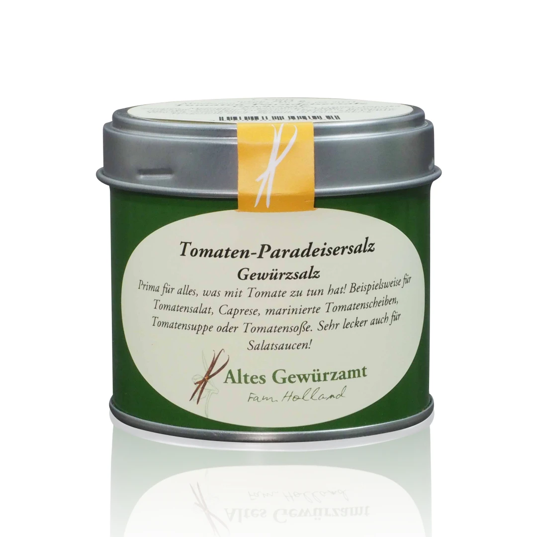 Mit diesem Tomatensalz / Paradeisersalz kaufen Sie ein von Altes Gewürzamt Ingo Holland sorgfältig ausgewähltes und zusammengestelltes Gewürz in bester Qualität. Gründer Ingo Holland – selbst langjähriger Spitzen- und Sternekoch – hatte irgendwann genug davon nur Gewürze kaufen zu können, die nicht seinem Qualitätsanspruch gerecht wurden. So entschloss er sich, selbst auf die Such nach besten Qualitäten von Gewürzen aus aller Welt zu gehen und diese in seiner eigenen Manufaktur handwerklich, schonend und sorgfältig zu verarbeiten. Berühmt auch seine Gewürzmischungen für Chili con Carne oder das italienisch toskanische Gewürzmischung für Pasta.