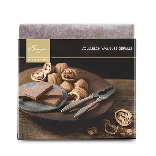 Eine zarte Creme mit aromatischen Walnüssen vereint sich in feinster Vollmilchschokolade mit 37 % Kakaoanteil zu einer perfekten Komposition.