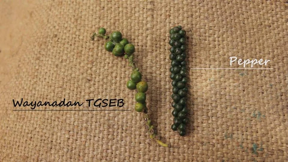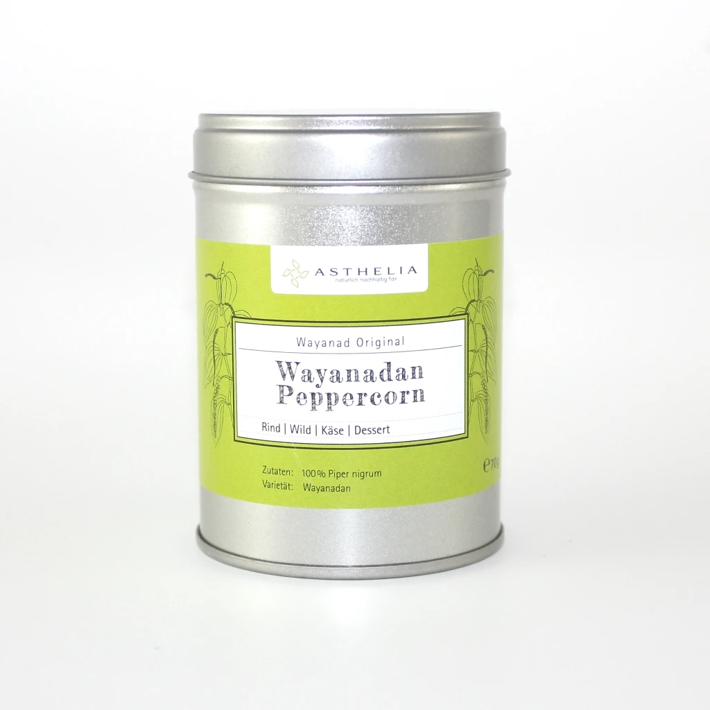 Die Pfeffer-Varietät ‚Wayanadan‘ gehört wohl zu den ersten identifizierten Pfeffer-Populationen überhaupt und wächst nur im Distrikt Wayanad, der indischen Provinz Kerala. Sie kann nicht industriell angebaut werden, sondern wird sortenrein in den Gewürzwäldern gesammelt, verarbeitet und verpackt. Das Original Wayanad Pfefferkorn ist ein Spätlese-Tellicherry Pfeffer der höchsten Güteklasse Garbled Special Extra Bold (TGSEB).