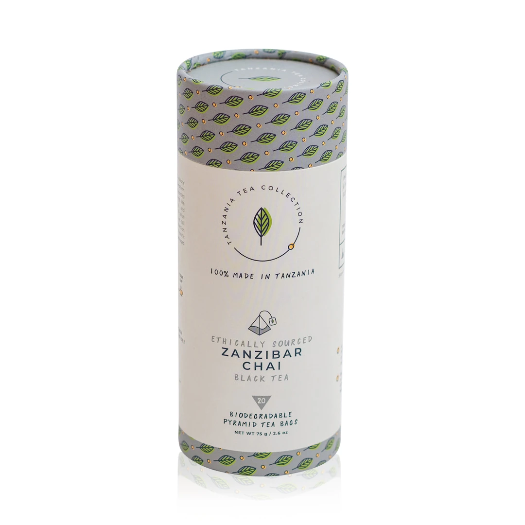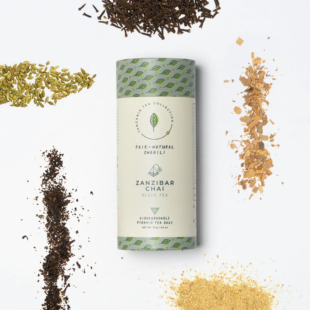 Ein authentischer Chai-Tee mit Gewürzen, die in Sansibar und Tanga angebaut werden: Schwarztee, Zimtrinde, Ingwer, grüner Kardamom und Nelken.